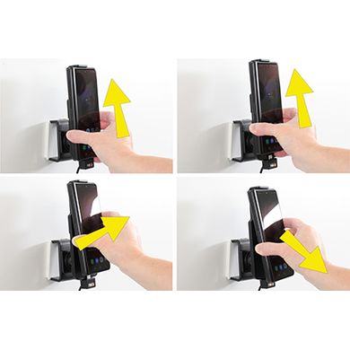 Suportul este foarte solid, telefonul nu se lipește și nu vibrează. Suportul are o balama, datorită căreia puteți roti cu ușurință telefonul în landscape sau portrait sau îl puteți înclina în orice moment. Suportul este atașat la Brodit ProClip.