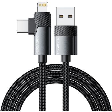 Universal Essager William 2-in-1 cablu de încărcare cu USB-A la Type-C/Lightning, conectori cu unghi de 90°, curent de 3A, lungime de 2m și împletitură cu 24 de straturi.