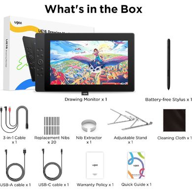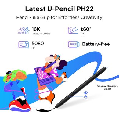 Rezoluția FHD (1920×1080) îmbunătățește considerabil claritatea ilustrațiilor detaliate. Ca urmare, fiecare aspect, de la liniile fine la umbrele îndrăznețe, este redat cu precizie. Ca urmare, această tabletă este oalegere excelentă pentru ilustratori, designeri grafici și oricine apreciază imaginile clare și vii. Ugee UE16 dispune de noul stylus EMR, proiectat cu un profil subțire și ergonomic pentru un desen ușor și confortabil. Acesta are 16.000 de niveluri de sensibilitate la presiune, recunoaște înclinarea la 60° și vă permite să creați tușe complexe cu intensități diferite, emulând senzația autentică de a desena cu un creion tradițional. În plus, butonul integrat de comandă rapidă al stylusului facilitează tranziția între funcțiile de stilou, radieră și mouse, făcându-l un instrument ușor de utilizat chiar și pentru artiștii începători.