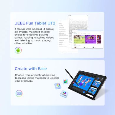 UGEE UT2 – Tabletă de desen de 10,36" cu ecran 2K, stylus, Android 14, CPU octa-core și 6 GB RAM. O soluție completă pentru arta digitală, învățare și divertisment.