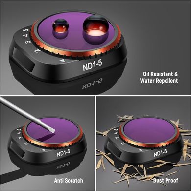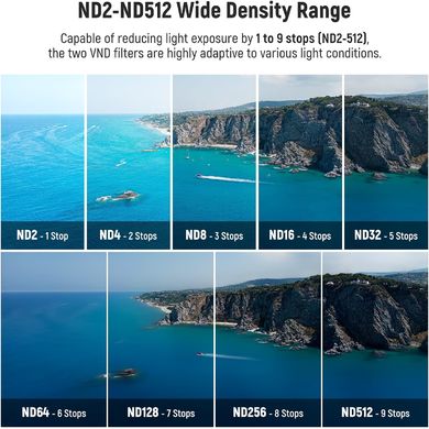 Set de 4 filtre de 90 mm compatibile exclusiv cu dronele DJI Mini 3 și DJI Mini 3 PRO. Două filtre au densitate neutră variabilă pentru obiectivele dronelor: 1–5 grade de reducere a luminii VND (ND2–32) și 6–9 grade de reducere a luminii VND (ND64–512). Această gamă mai largă de densități permite manipularea ușoară a expunerii în diferite condiții de iluminare atunci când se realizează fotografii aeriene de pe o dronă. Pentru o culoare și un contrast mai bune în lumina puternică a soarelui, este inclus un filtru CPL pentru a întuneca cerul și a reduce strălucirea de la suprafețele nemetalice, cum ar fi apa, sticla și plantele.