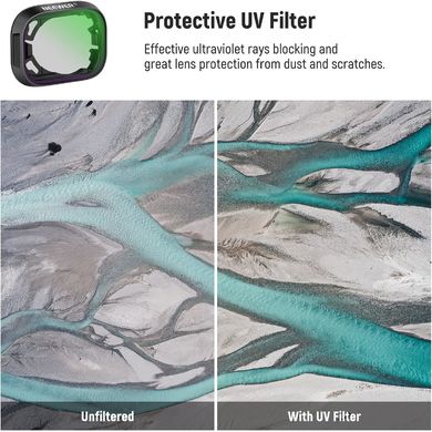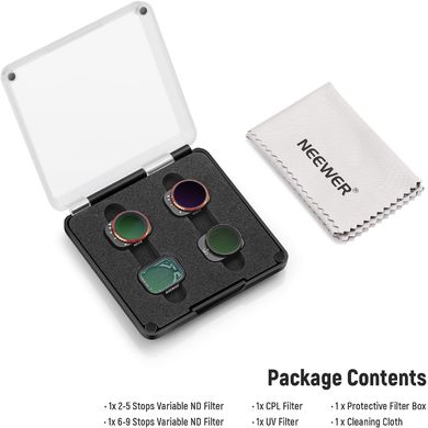 Pachetul include, de asemenea, un filtru UV care blochează razele ultraviolete și elimină nuanța albăstruie din imagini. Filtrele pentru drone din sticlă optică HD de la NEEWER ajută la realizarea unor fotografii clare și sunt rezistente la apă, zgârieturi, praf și amprente datorită straturilor multiple de acoperiri NANO de pe ambele părți ale filtrelor. Ramele filtrelor ușoare de 3,2 g sunt fabricate din aliaj de aluminiu de calitate aerospațială șinu interferează cu calibrarea și echilibrul dronei.