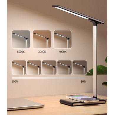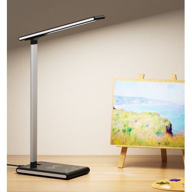 Lampă de masă LED, 3 temperaturi ale luminii. 5 intensități de lumină, încărcător wireless 10W, ieșire de încărcare USB, ceas, alarmă, calendar, termometru.