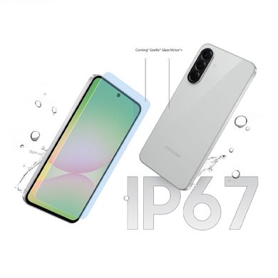Samsung Galaxy A56 5G oferă un design modern, cu un profil subțire și o ramă metalică pentru rezistență și durabilitate. Fața și spatele sunt acoperite cu sticlă călită Corning® Gorilla® Glass Victus®+, protejând telefonul de zgârieturi și lovituri. În plus, este rezistent la apă și praf.