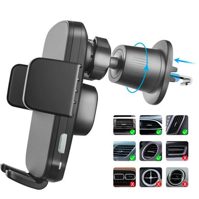 Suport pentru telefon auto cu încărcare wireless pentru montare în grila de ventilație. Suportul poate fi operat cu ușurință cu o singură mână datorită fixării și eliberării automate a telefonului. Telefonul se încarcă prin intermediul unui adaptor pentru țigări. Ideal pentru toate telefoanele, inclusiv pentru telefoanele Apple.